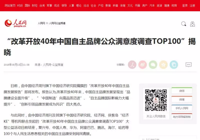 日前,人民日報社《中國經(jīng)濟(jì)周刊》、中國經(jīng)濟(jì)研究院、中國經(jīng)濟(jì)網(wǎng)聯(lián)合國內(nèi)多家門戶網(wǎng)站、官方新媒體發(fā)起了“改革開放40周年中國自主品牌公眾滿意度調(diào)查TOP100”大型公益評選活動。
