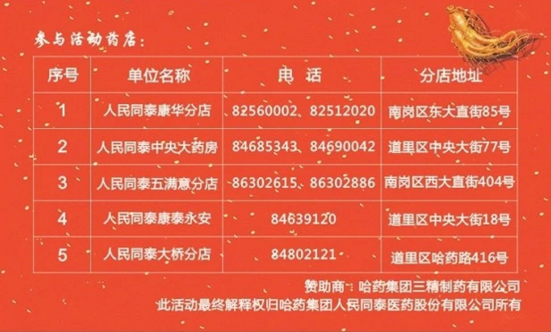 隨著哈爾濱市廣場舞大賽的完美謝幕,人參蜂王漿、刺五加王漿口服液三贈一產(chǎn)品動銷活動也隨之啟動。三精蜂王漿系列產(chǎn)品優(yōu)惠活動在人民同泰正式開啟,消費(fèi)者在2018年10月10日——10月31日期間在以下人民同泰藥店購買三精牌人參蜂王漿、刺五加王漿口服液,即可享受買3贈1的優(yōu)惠。