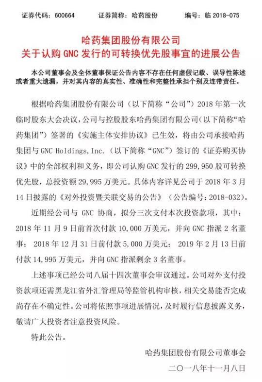 【哈藥公告】哈藥集團(tuán)股份有限公司 關(guān)于認(rèn)購 GNC 發(fā)行的可轉(zhuǎn)換優(yōu)先股事宜的進(jìn)展公告