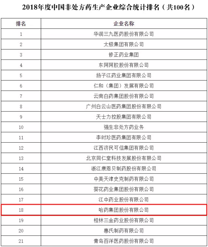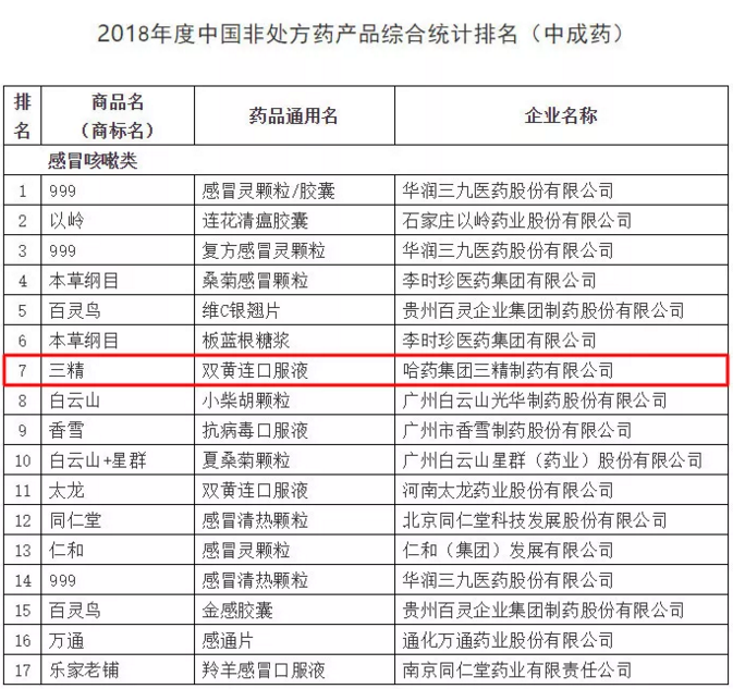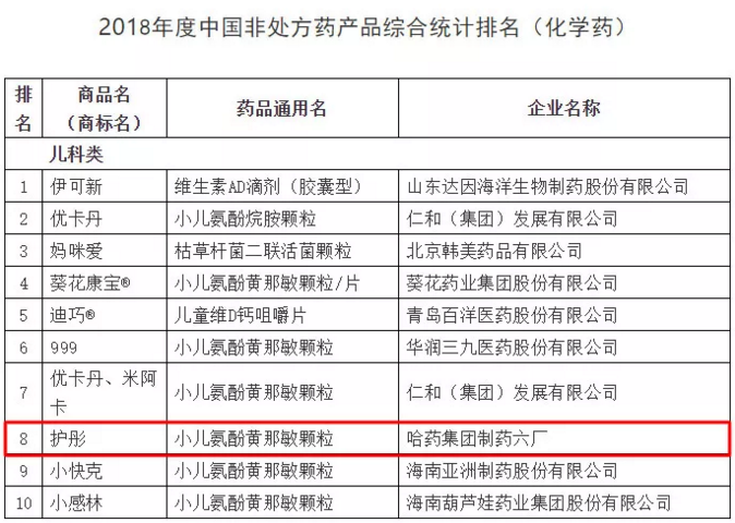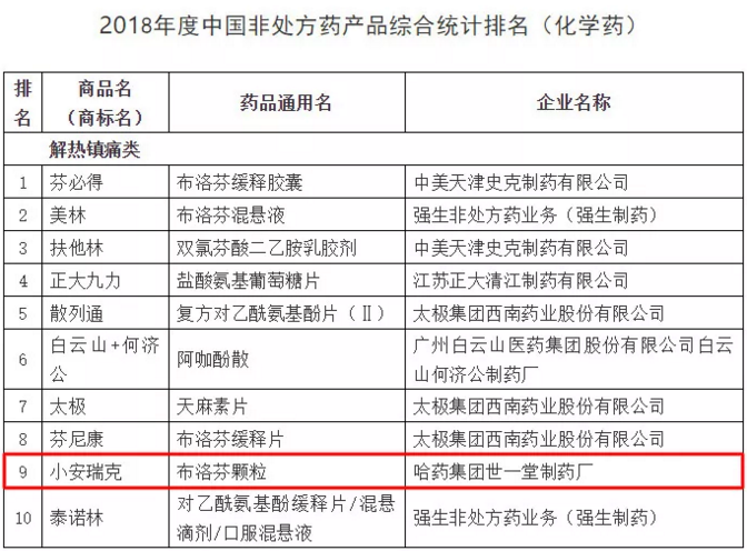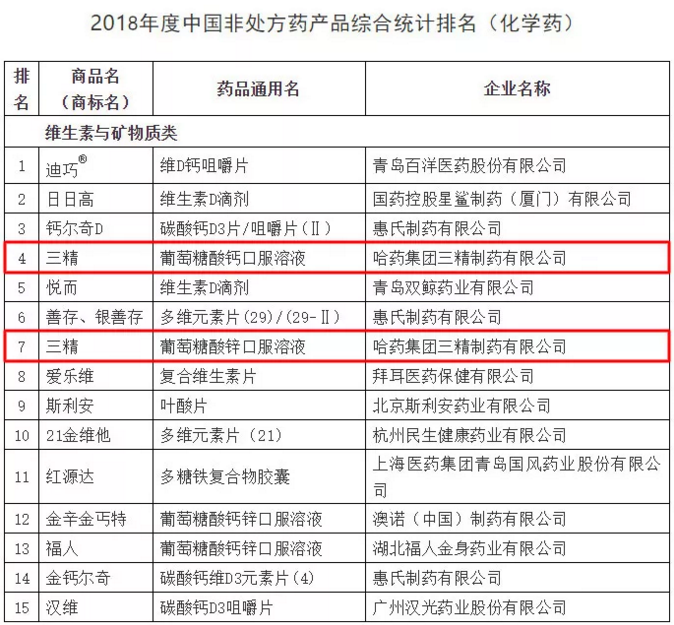 非處方藥企業(yè)及產(chǎn)品品牌2018年度調(diào)研結(jié)果是依據(jù)2017年全年企業(yè)出廠(chǎng)價(jià)(含稅)為準(zhǔn)的銷(xiāo)售額進(jìn)行計(jì)算統(tǒng)計(jì)。其中,哈藥集團(tuán)世一堂制藥廠(chǎng)(小安瑞克)布洛芬顆粒、哈藥集團(tuán)三精制藥有限公司葡萄糖酸鈣口服溶液、葡萄糖酸鋅口服溶液、哈藥集團(tuán)制藥六廠(chǎng)(護(hù)彤)小兒氨酚黃那敏顆粒在化藥領(lǐng)域,哈藥集團(tuán)三精制藥有限公司雙黃連口服液在中成藥領(lǐng)域位居榜內(nèi)。