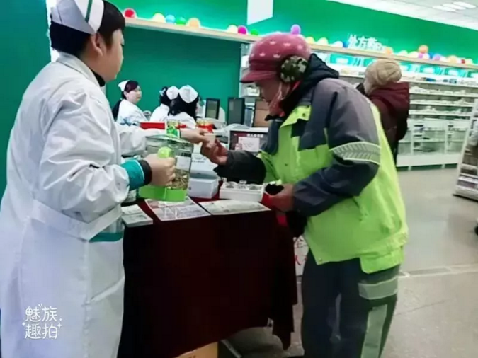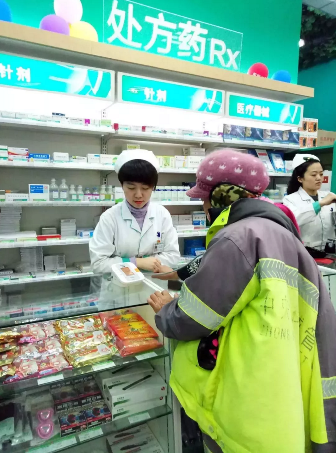 人民同泰學(xué)苑分店,店內(nèi)設(shè)有免費(fèi)檢測血壓的服務(wù)臺,隨時為環(huán)衛(wèi)工人提供各方面服務(wù)。在店里測血壓的宋師傅說:“我們環(huán)衛(wèi)工人在戶外作業(yè),常有手指刮破的時候。每次來,店員都免費(fèi)給包扎傷口,幫忙換藥。我們隊(duì)的環(huán)衛(wèi)工都和店員認(rèn)識了,誰血壓高、誰低血糖,他們都知道。只要來就給測血壓血糖,告訴應(yīng)該注意什么,有個頭疼腦熱,店員還給感冒藥吃,我們的心里都暖乎乎的。”