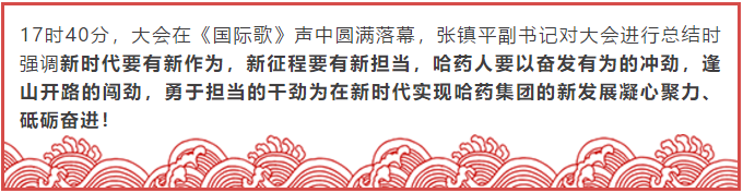 最后,全體黨代表審議通過《黨委工作報(bào)告》《紀(jì)委工作報(bào)告》《黨費(fèi)收繳、使用、管理情況的報(bào)告》及《中國共產(chǎn)黨哈藥集團(tuán)有限公司第一次代表大會(huì)決議(草案)》。